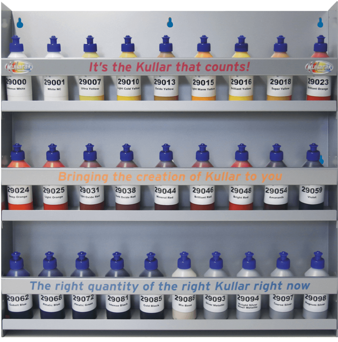 Kullarak is a compact and functional wall mounted system housing all your tinters. Keep it neat, Keep it tidy!
